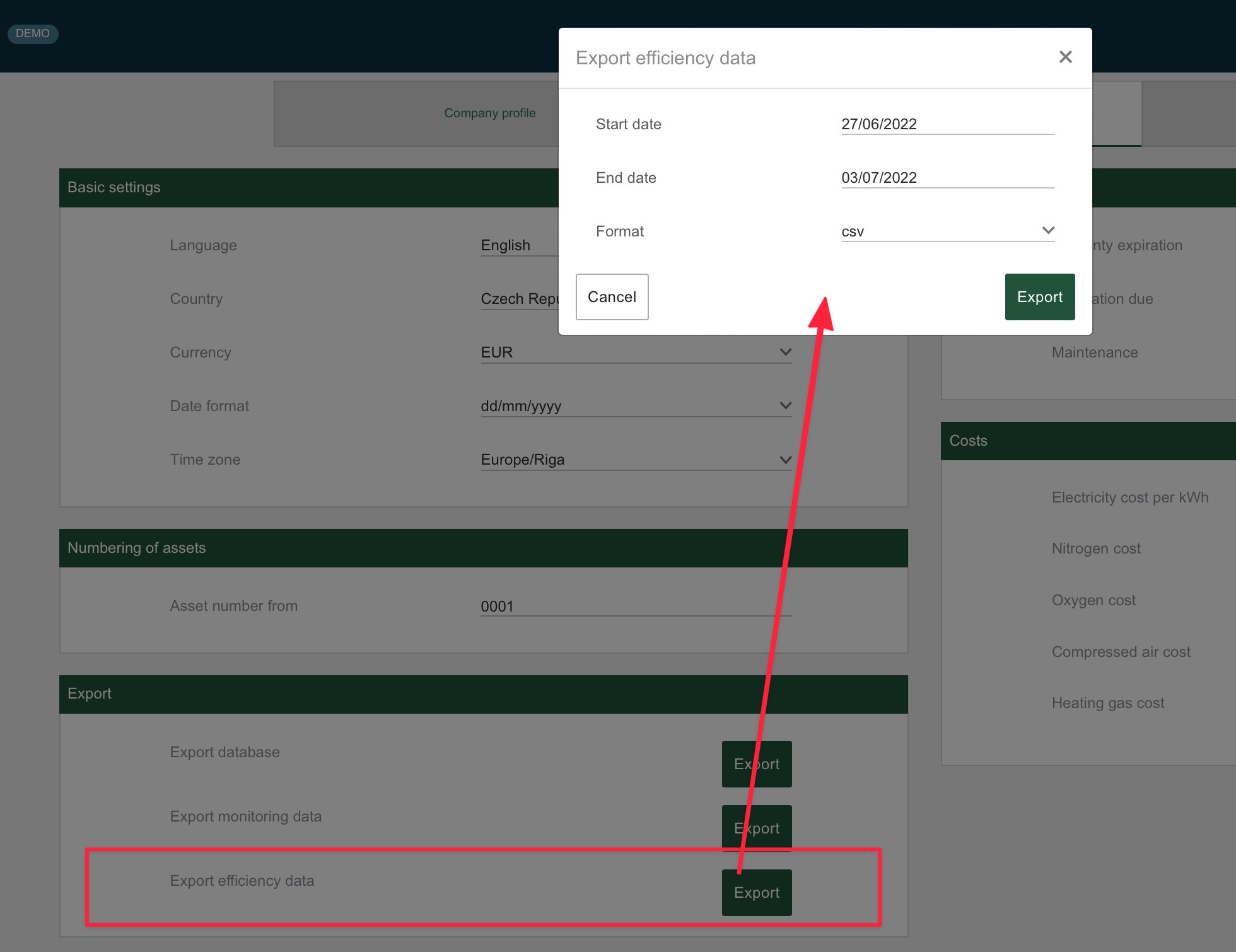 Data export is available with Efficiency calculated per shift for selected period of time in CSV and JSON formats.