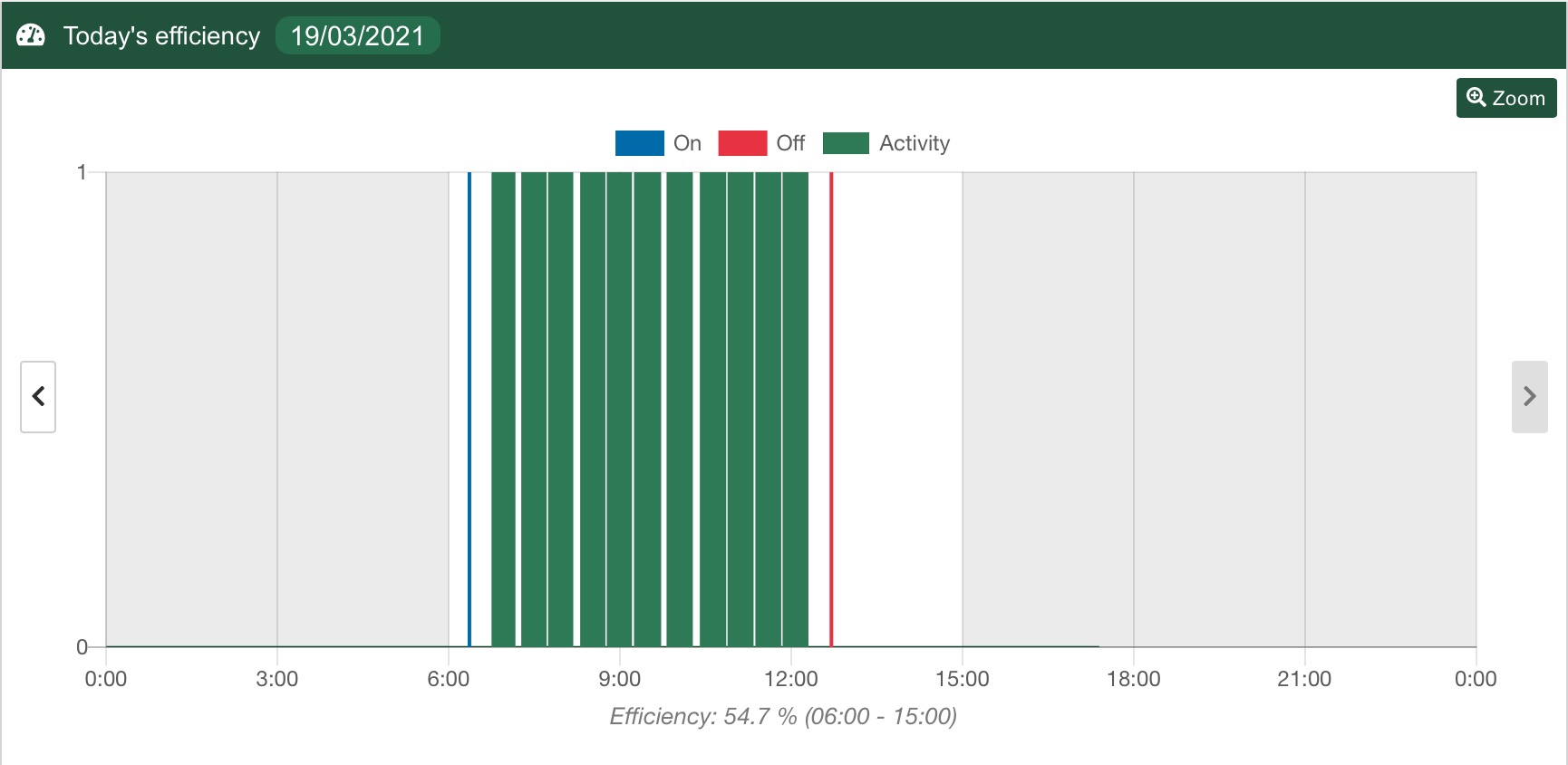 In case machine has got set up work hours schedule, machine idling time during the day is considered within these hours. Due to correct idle time, efficiency is now more real. This is suitable monstly for machines that are not being turned off after work. In the following example, on the left picture, machine is turned on for whole day with not work schedule set. Right picture shows the same machine with work schedule set, efficiency is higher because idling outside of scheduled work time is not counted.
